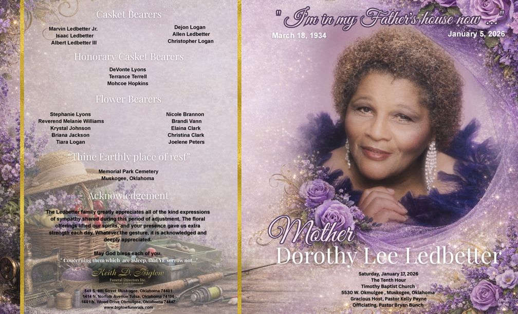 You may visit Mother Ledbetter, as she slumbers in sweet repose at the Keith D. Biglow Funeral Directors, Inc., on Friday, January 16, 2026, between the hours of 2:00 PM and 6:00 PM.